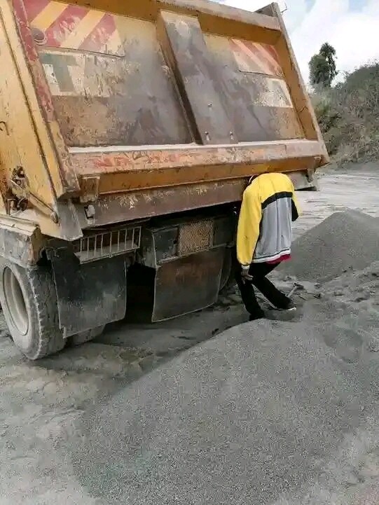 This can only make sense if he was inside the bucket while tipper was unloading then slid downwards.