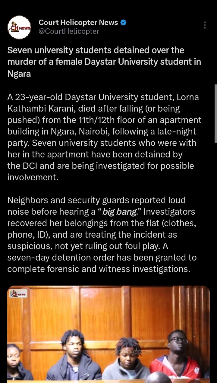 I had a friend whose sister and everyone in the party were held for 1 year in remand.Kenyan police are stupid at times. So her sisters and bf alikunywa akaanza kuwa erratic and kusumbua akatolewa nje kwa mlango.Wakajifungia wakendela kupiga sherehe but jamaa anaendelea kusumbua kwa dirisha.After a while..jamaa akakimbia corner mbili akajirusha toka 7th level ya hizo apartments pale Mlolongo.