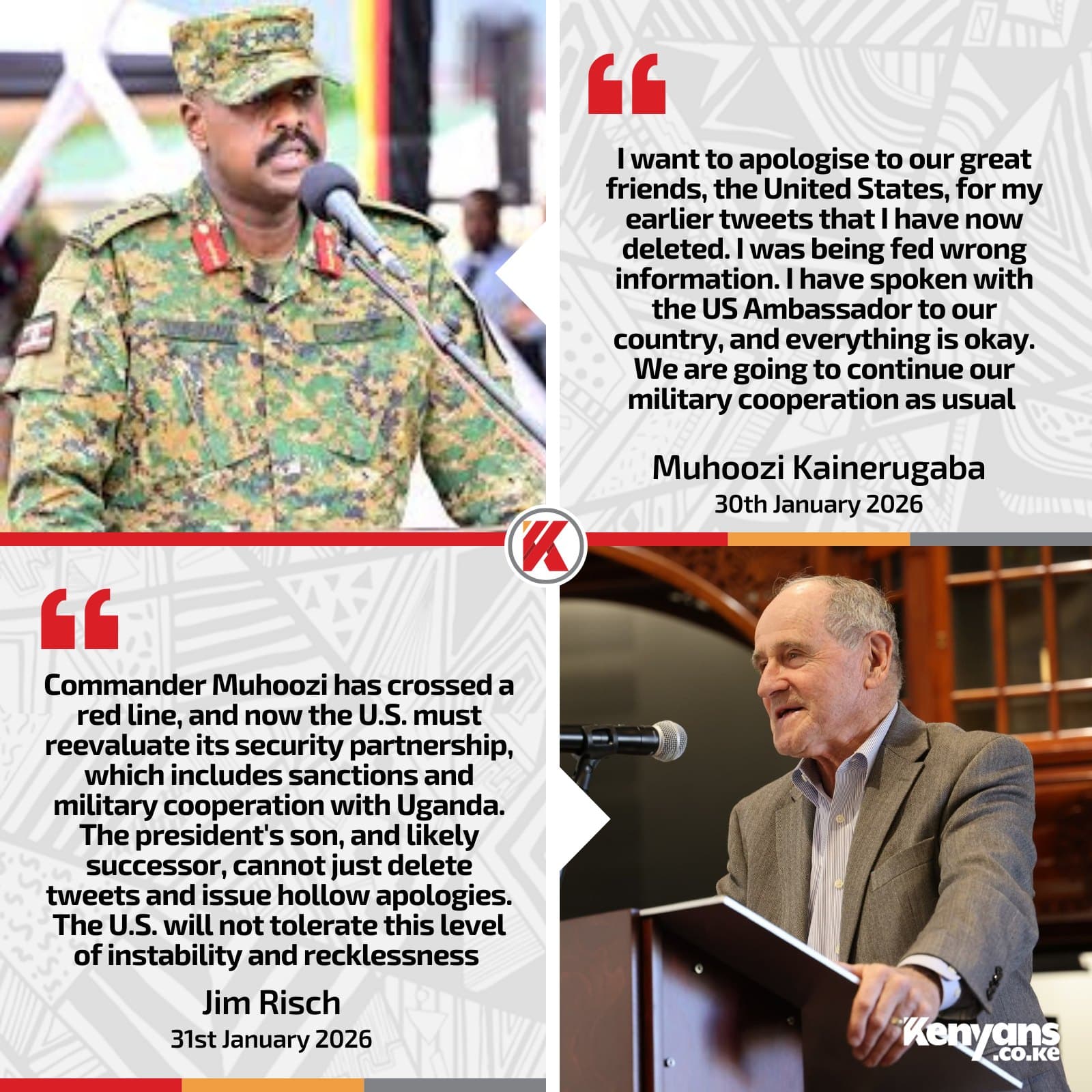 - Hostility Toward the U.S. (January 2026): Most recently, Muhoozi claimed to suspend all military cooperation with the U.S., accusing American embassy staff of coordinating a “kidnapping” of opposition leader Bobi Wine. Although he later deleted the tweets and apologized, U.S. Senator Jim Risch called his actions “reckless” and urged a review of security ties.