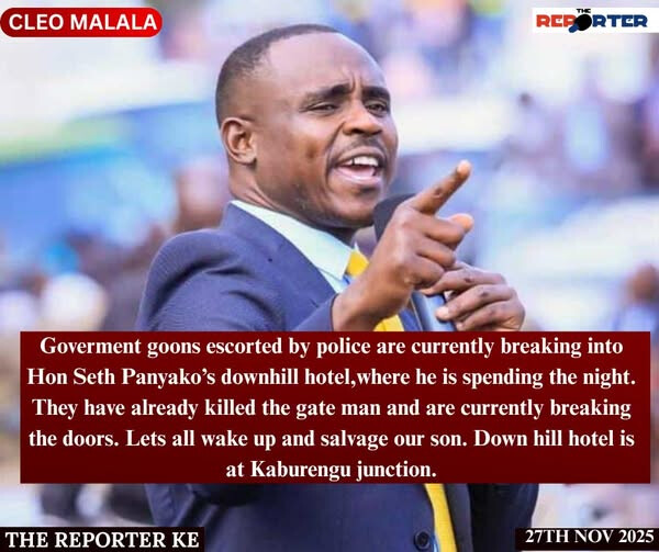 Malala drops shocking night news-Government goons escorted by police are currently breaking into Hon Seth Panyako’s downhill hotel, where he is spending the night. They have already killed the gate man and are currently breaking the doors. Lets all wake up and salvage our son. Down hill hotel is at Kaburengu junction.