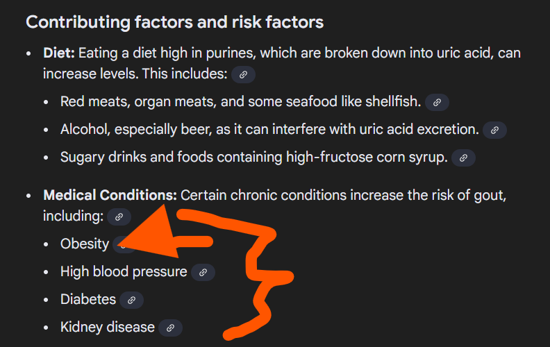 Ha, fuck that shit, its called self awareness. I have had gout hit me severally in the past especially when I used to do alcohol and those nonsense processed food due to increase in disposable income, now I’m wiser, eat healthy, drink lots of water and stay fit, you won’t have to worry about purines
