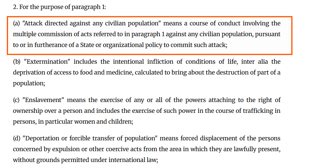 Defines “attack against a civilian population” as a course of conduct involving multiple acts against civilians pursuant to a State or organizational policy.
