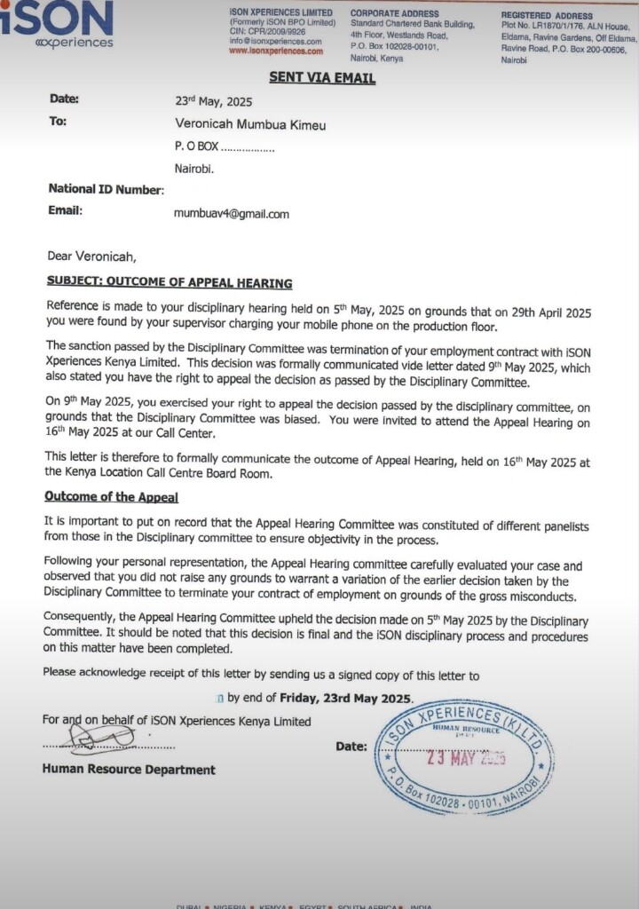 She appealed the decision, it was upheld. The people who made the decision to sack her and the ones who upheld the decision after appeal were not stupid. Just let Kimeu (this name almost sounds obscene) look for a job where she can charge her phone all day.
