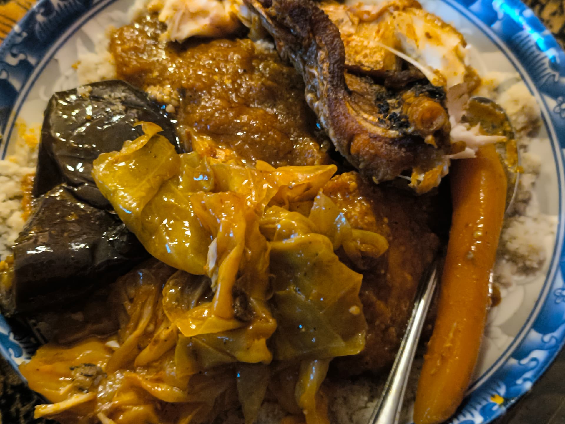 Very minimal coconut oil n spices. Kuna yam, pumpkin,egg plant, cabbage, carrot, fonio, kingfish.