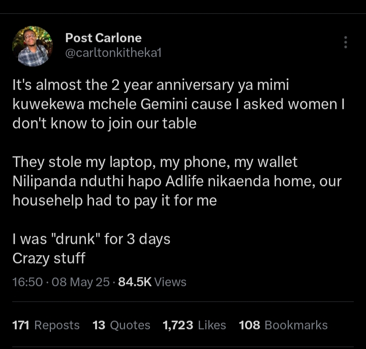 Kuna client wangu wa bnb amenishow how he got robbed and assaulted at Gemin hadi akavunjwa mkono. Gemini ni ghetto nowadays but uyo academic writer still thinks it’s something to brag about