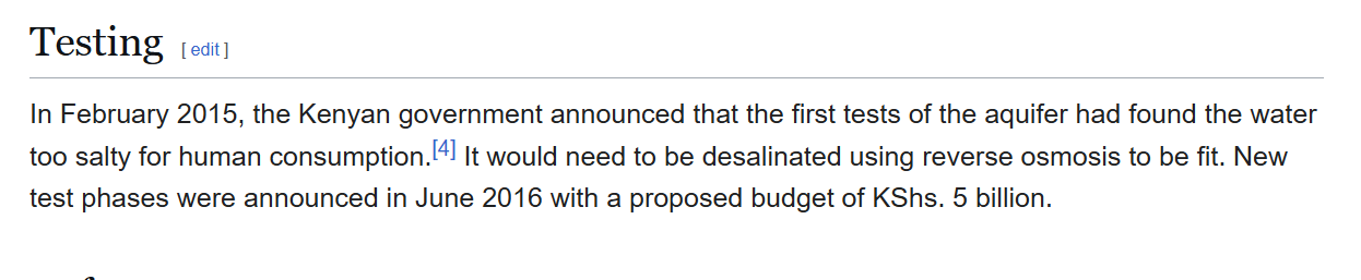 Haiwezi, the acquifer has been found to be extremely saline. Hiyo majine iko na chumvi kuliko indian ocean. To clean it would require 5 billion a year just for test phases. Final count no about 30 billion a year