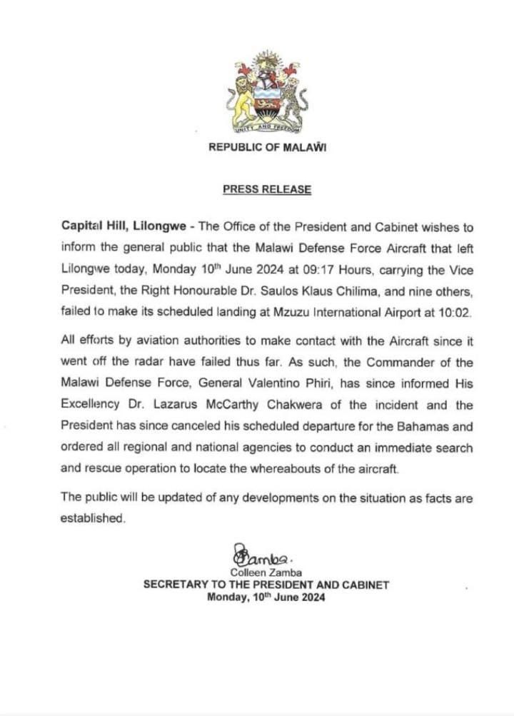 The Malawi VP’s airplane has gone missing
