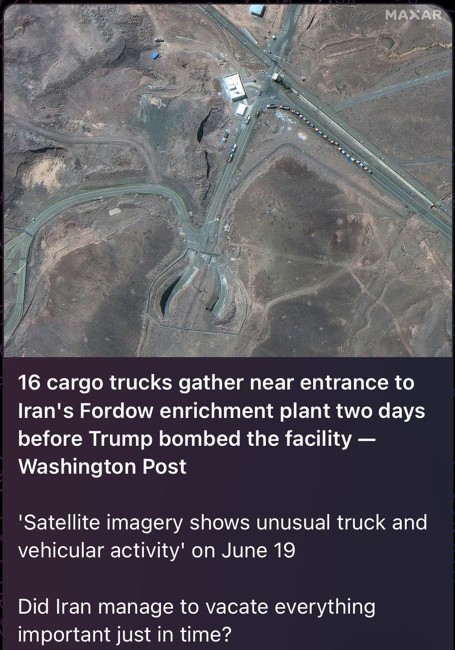16 cargo trucks gather near entrance to Iran’s Fordow enrichment plant 48hrs before Trump bombed the facility — Washington Post