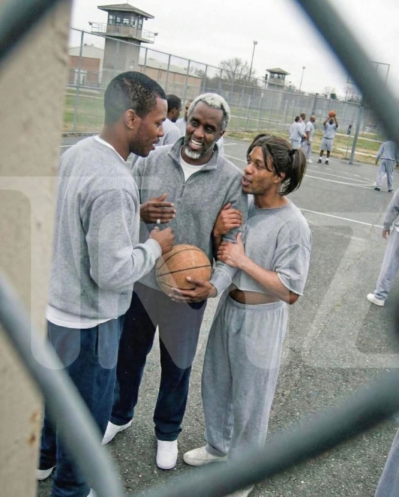 Everyone is clean, well-groomed, and wearing identical, spotless clothing, which is uncommon in real prison yard photos.