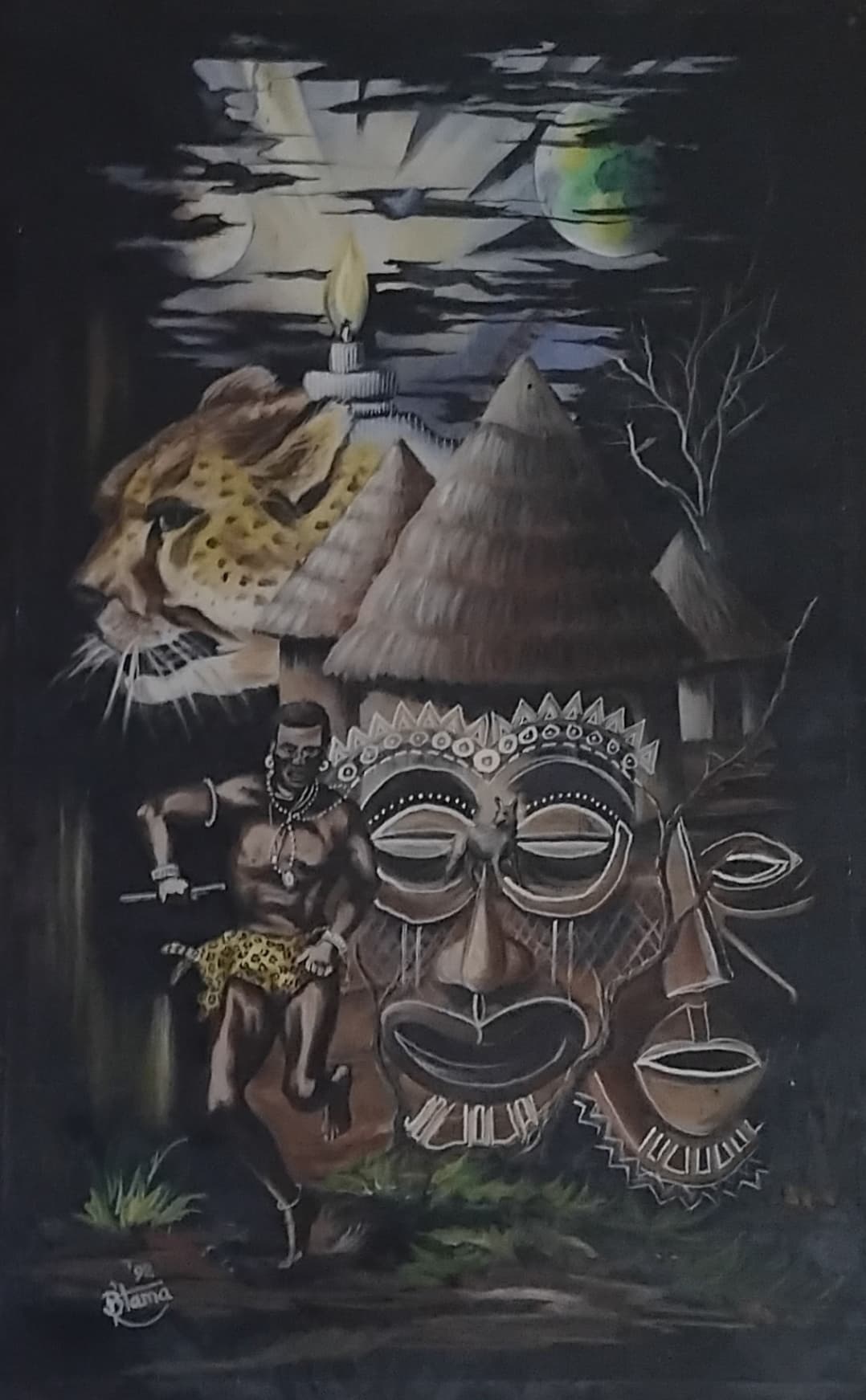 This style, often categorized as Neo-Tribal Symbolism, merges traditional African spiritual motifs with surreal compositional framing (moon, candle, and cosmic light suggesting ancestral presence).