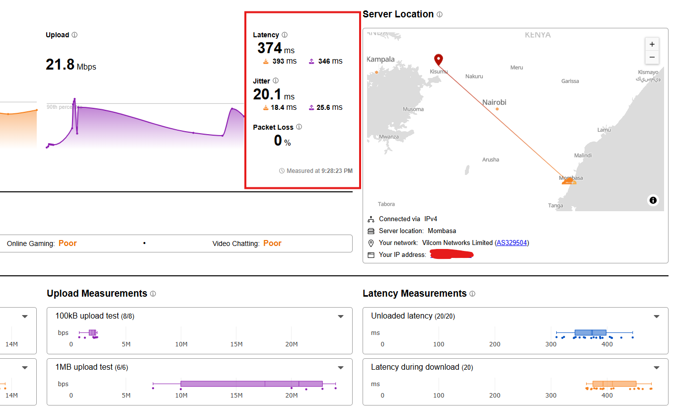 I have no idea how you get close to half a second of latency within Kenya but here it is! It’s strange because I think 4G internet, for a peer to peer game, gets around 40ms - 100ms from Kisumu to Mombasa.