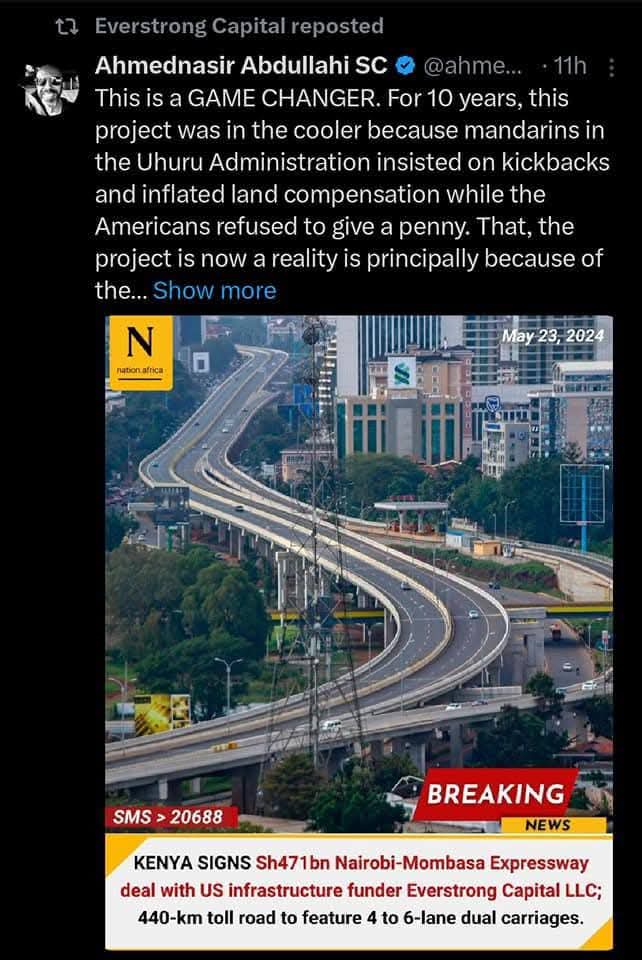I was drawn in when it retweeted a propaganda Tweet by Ahmednassir saying Rtd. President Uhuru Kenyatta had inflated the cost. Uhuru’s total cost was 309 Billion, and it was to be awarded to a more than 125-years old Yues company- Bechtel Corporation. It was dropped, and the argument then was that the funding (PPP) was impractical.