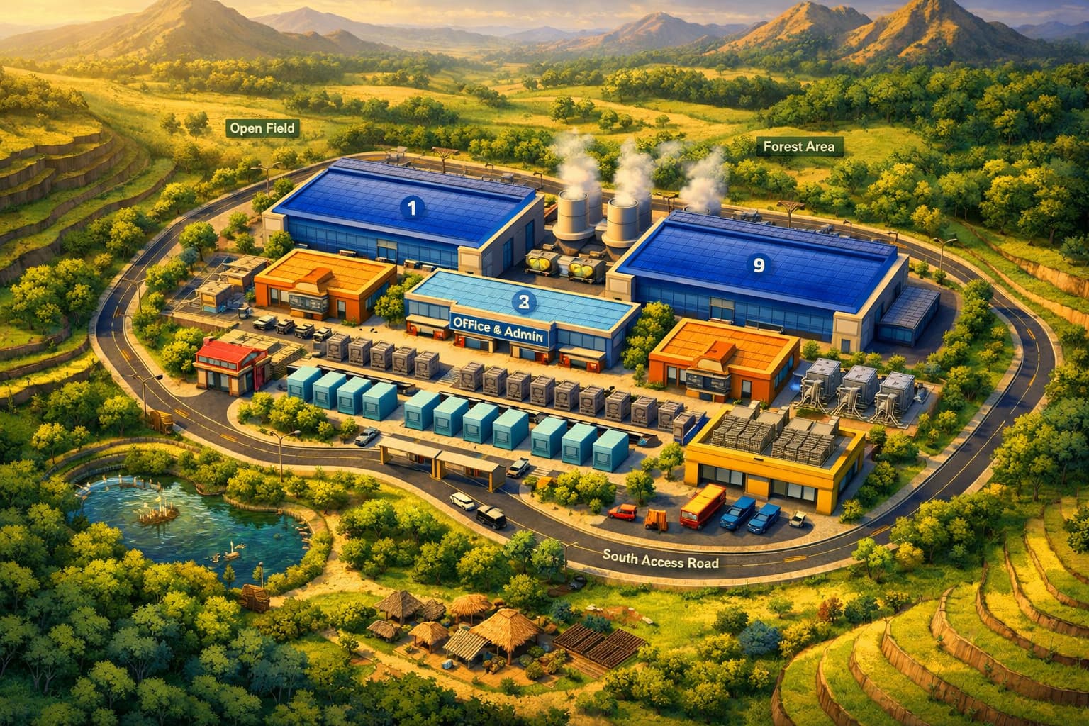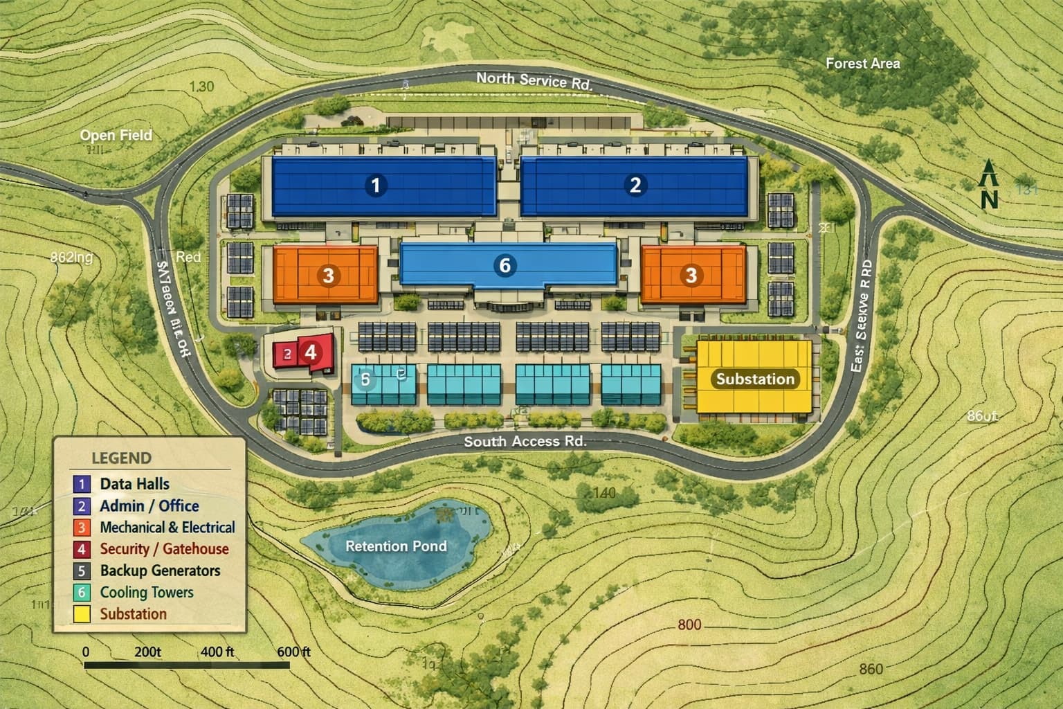 Nairobi, Kenya, stands out as a prime candidate for hosting such a facility. It offers political stability, fiber connectivity via undersea cables, and proximity to regional markets. The city’s elevation and temperate climate also support efficient cooling, reducing operational costs. A topographic layout—like the one rendered for this concept—would integrate the data center with surrounding infrastructure, including access roads, retention ponds, and forest buffers for environmental compliance.