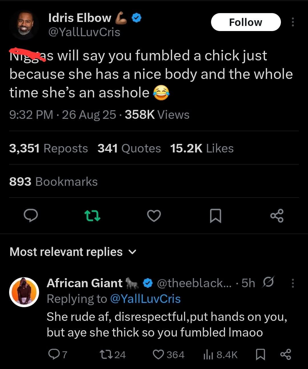 Someone having a great body and being a piece of shit human being is no excuse to continue dating. You’re not a mental institution of correcting lifelong bad upbringing. Stop making thots and idiots feel important because they have bulging buttocks