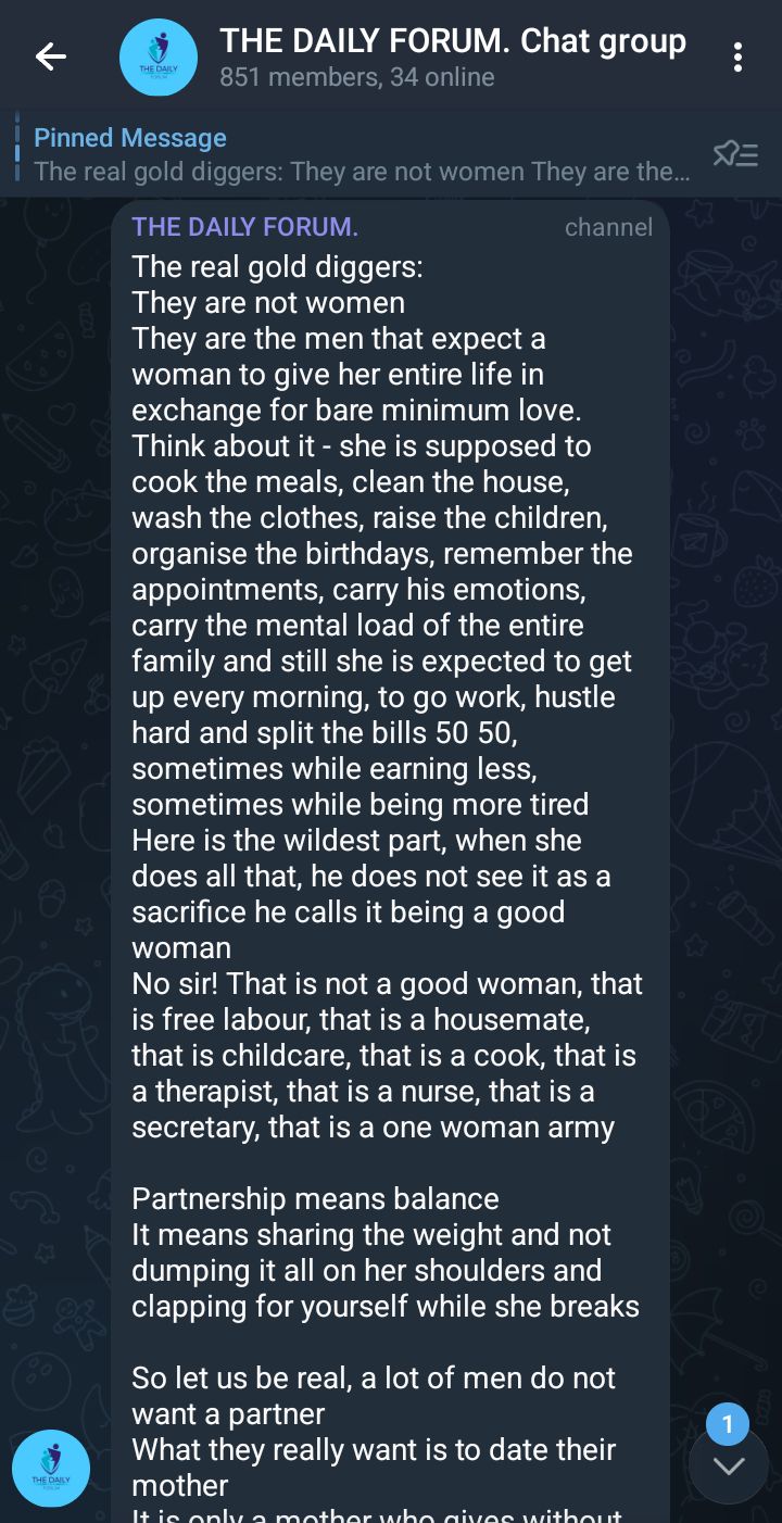 Think about it - she is supposed to cook the meals, clean the house, wash the clothes, raise the children, organise the birthdays, remember the appointments, carry his emotions, carry the mental load of the entire family and still she is expected to get up every morning, to go work, hustle hard and split the bills 50 50, sometimes while earning less, sometimes while being more tired